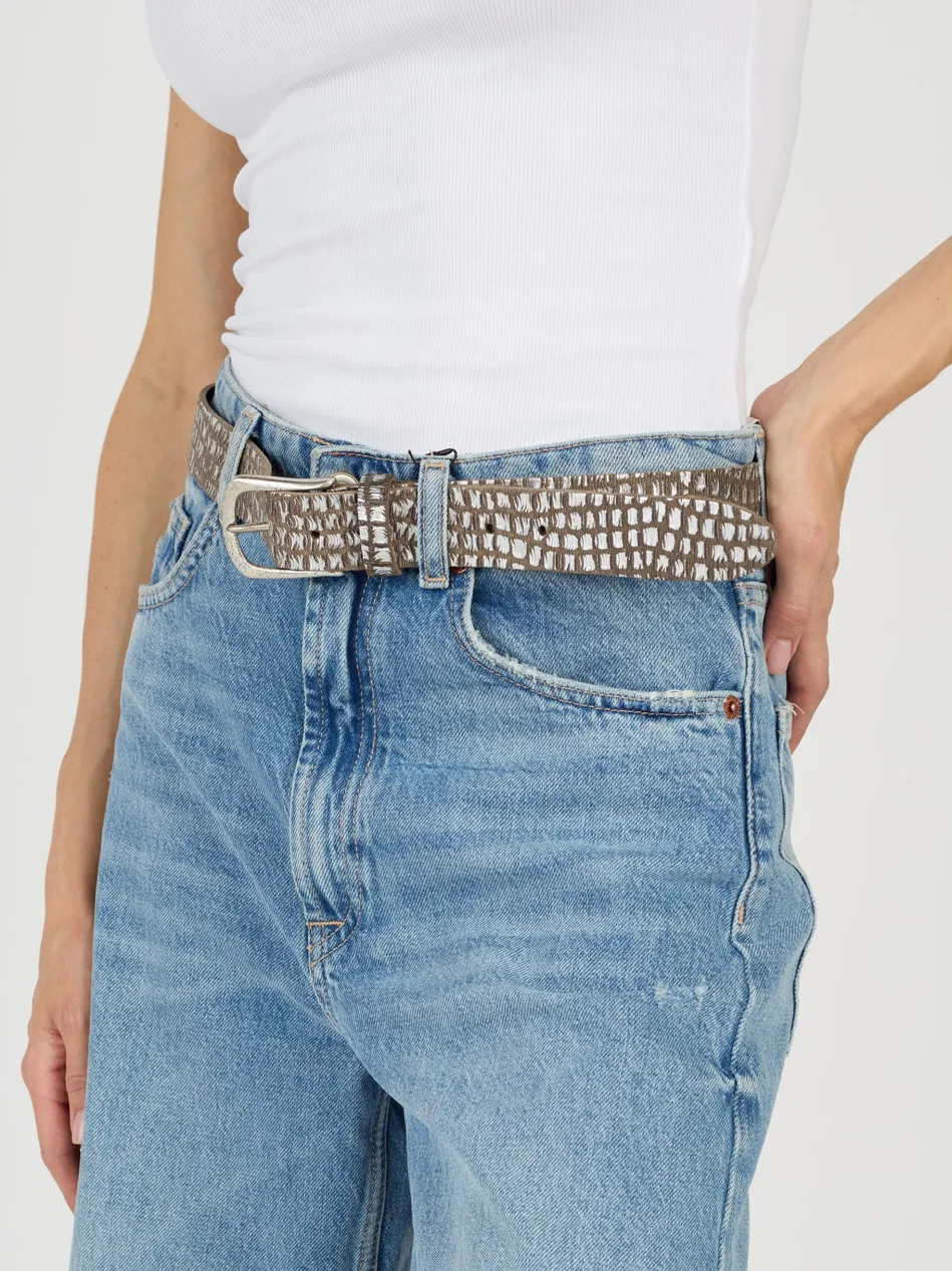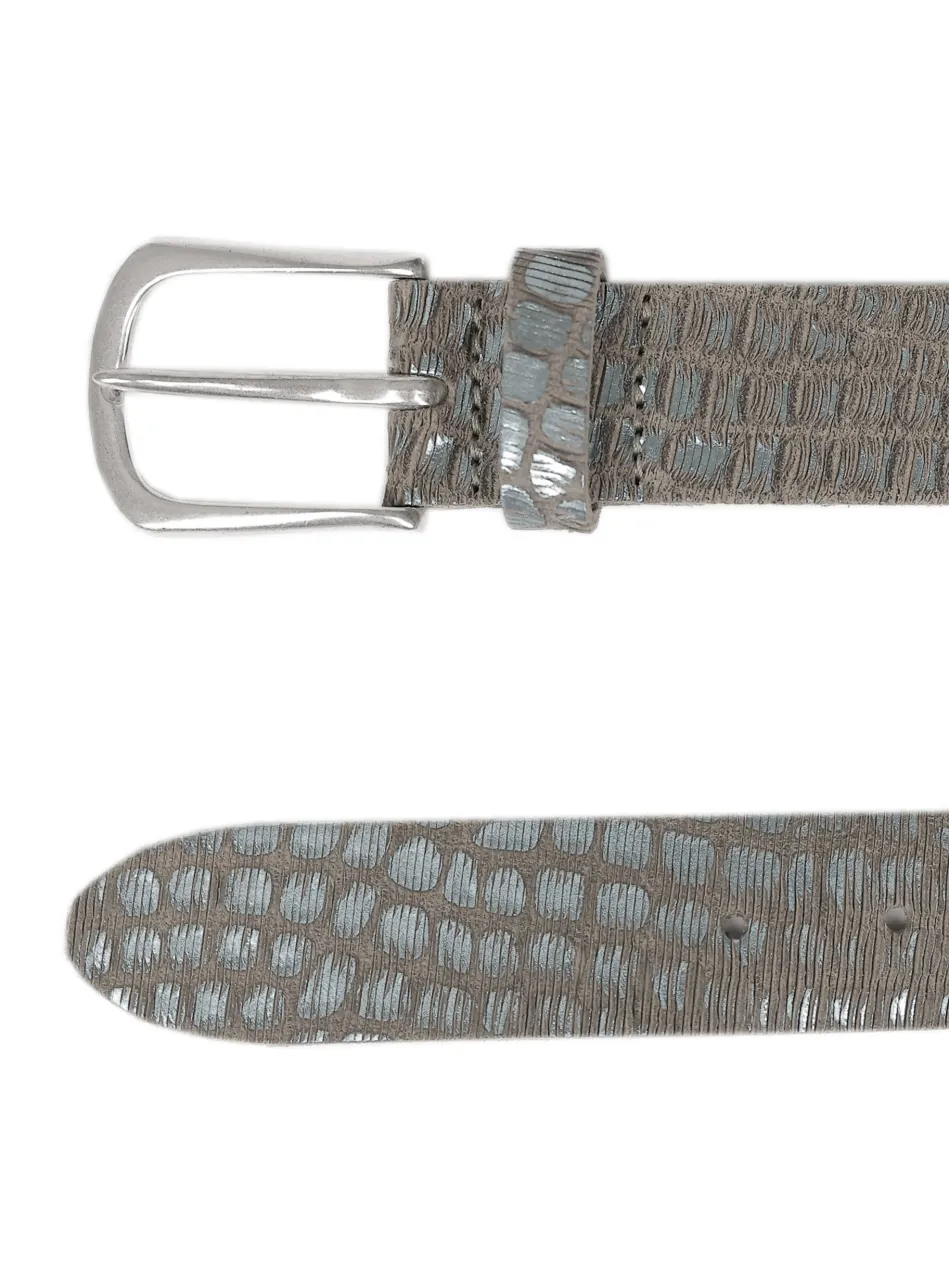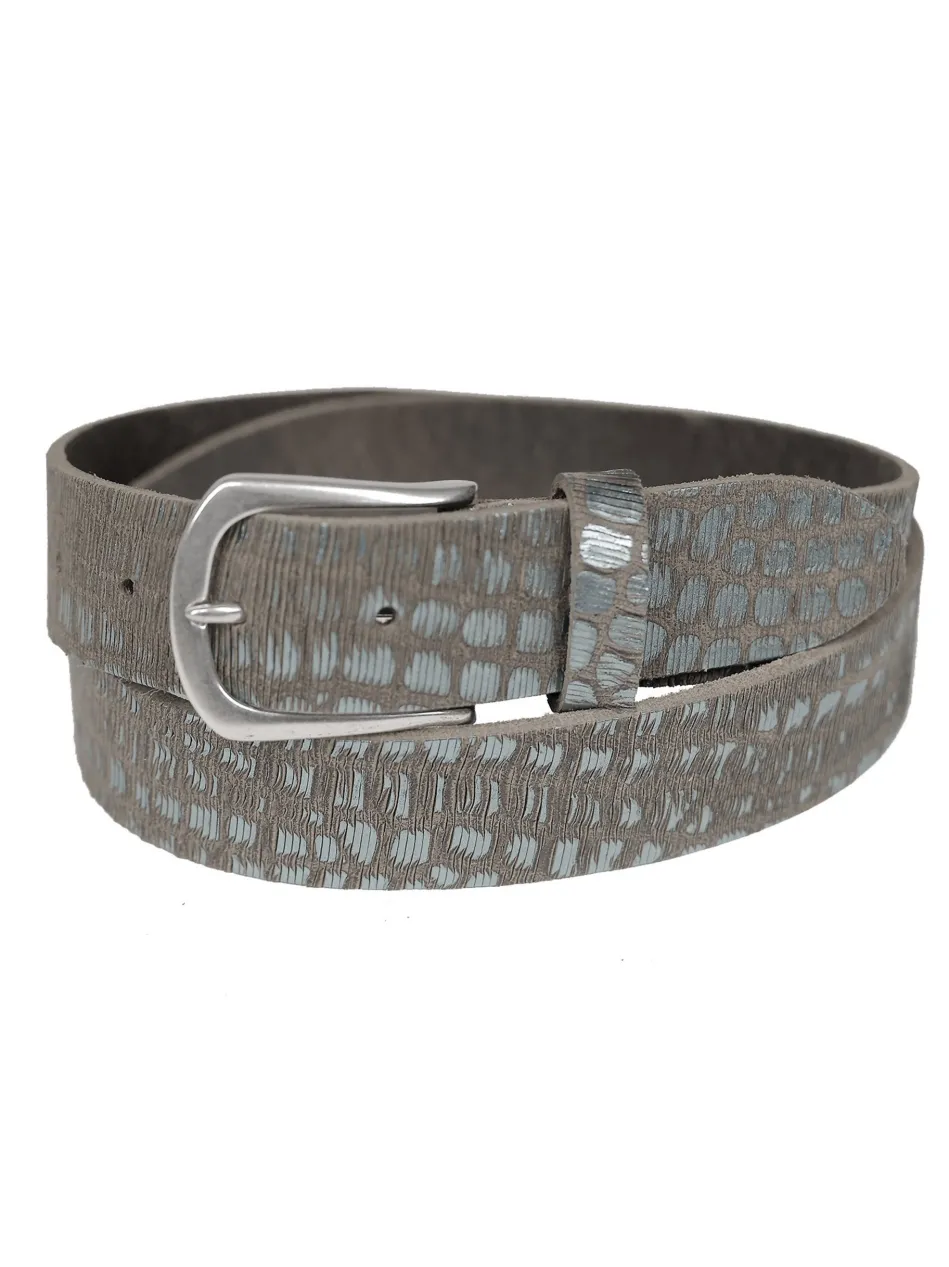 Dieser handgefertigte Gürtel aus robustem Rindleder mit metallic Look überzeugt durch seine außergewöhnliche Optik und hochwertige Verarbeitung. Das geprägte Muster unterstreicht den individuellen Charakter und macht den Gürtel zu einem echten Blickfang. Ideal für jeden, der Wert auf ein besonderes Design legt.
