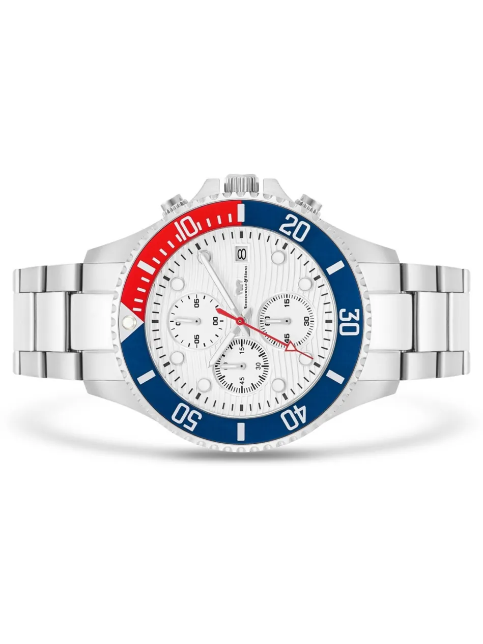 Sie suchen für Ihre Uhrensammlung einen sportlichen Chronographen-Klassiker? Dann ist dieses Modell mit Datum und Stoppuhr aus der Manufaktur Rhodenwald & Söhne eine gute Wahl: Das Design des Zeitmessers spielt gekonnt mit seinen Wurzeln im Flugsport: Drei Totalisatoren im mehrlagigen Zifferblatt werden eingerahmt von einer drehbaren, gekerbten Lünette mit der charakteristischen Farbmarkierung.