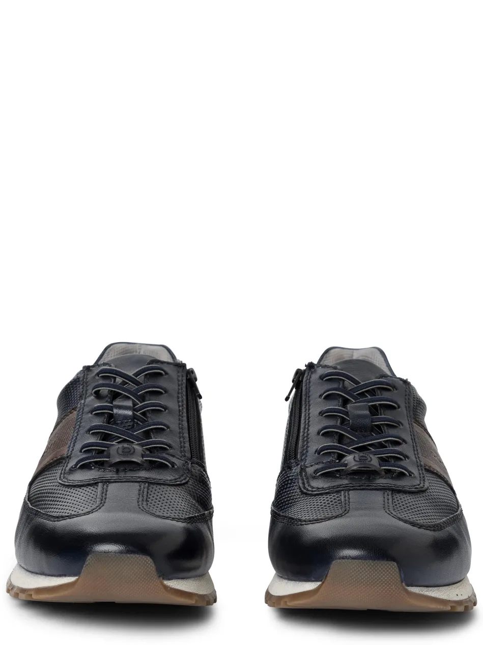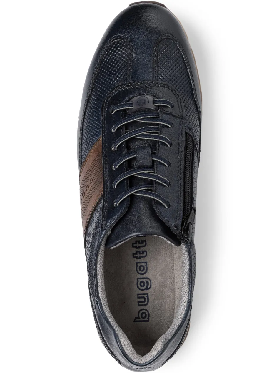 Der Bugatti Freizeitschuh aus Mesh-Textil kombiniert elegantes Leder mit sportlichem Mesh und bietet dank Schnürung und Zip-Verschluss Komfort und Stil für jede Gelegenheit.