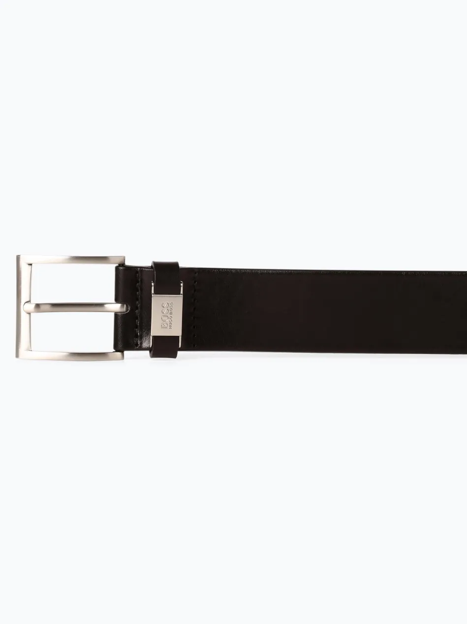 Die gravierte Logo-Plakette verleiht dem hochwertigen Ledergürtel Connio von BOSS einen markanten Style-Stempel.