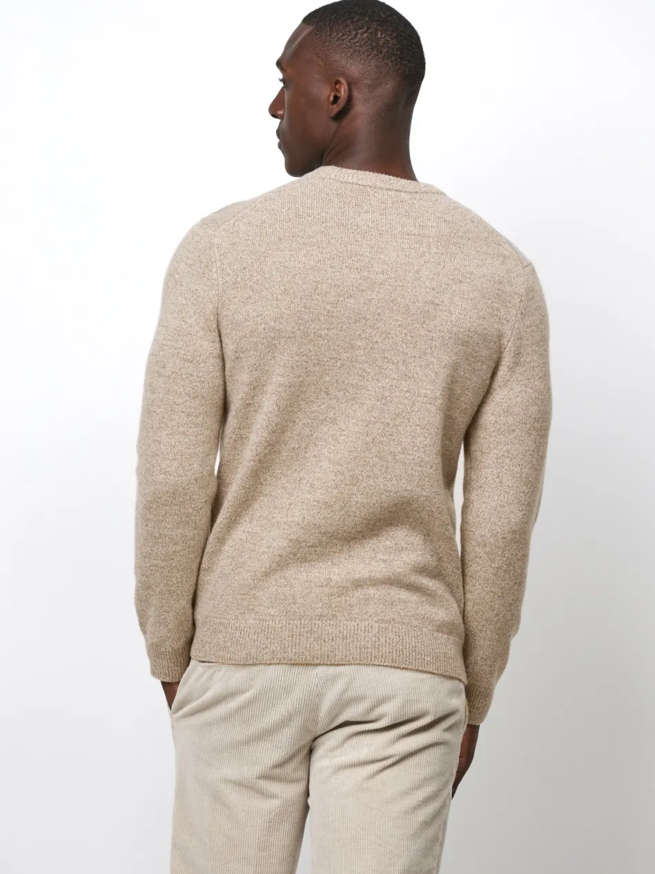 Dieser Rundhalspullover ist aus einem hochwertigen zweifarbigen Garn gestrickt. Die Wollmischung hält zudem wunderbar warm. Das kontrastierende Detail im Nacken sorgt für einen schönen Effekt.