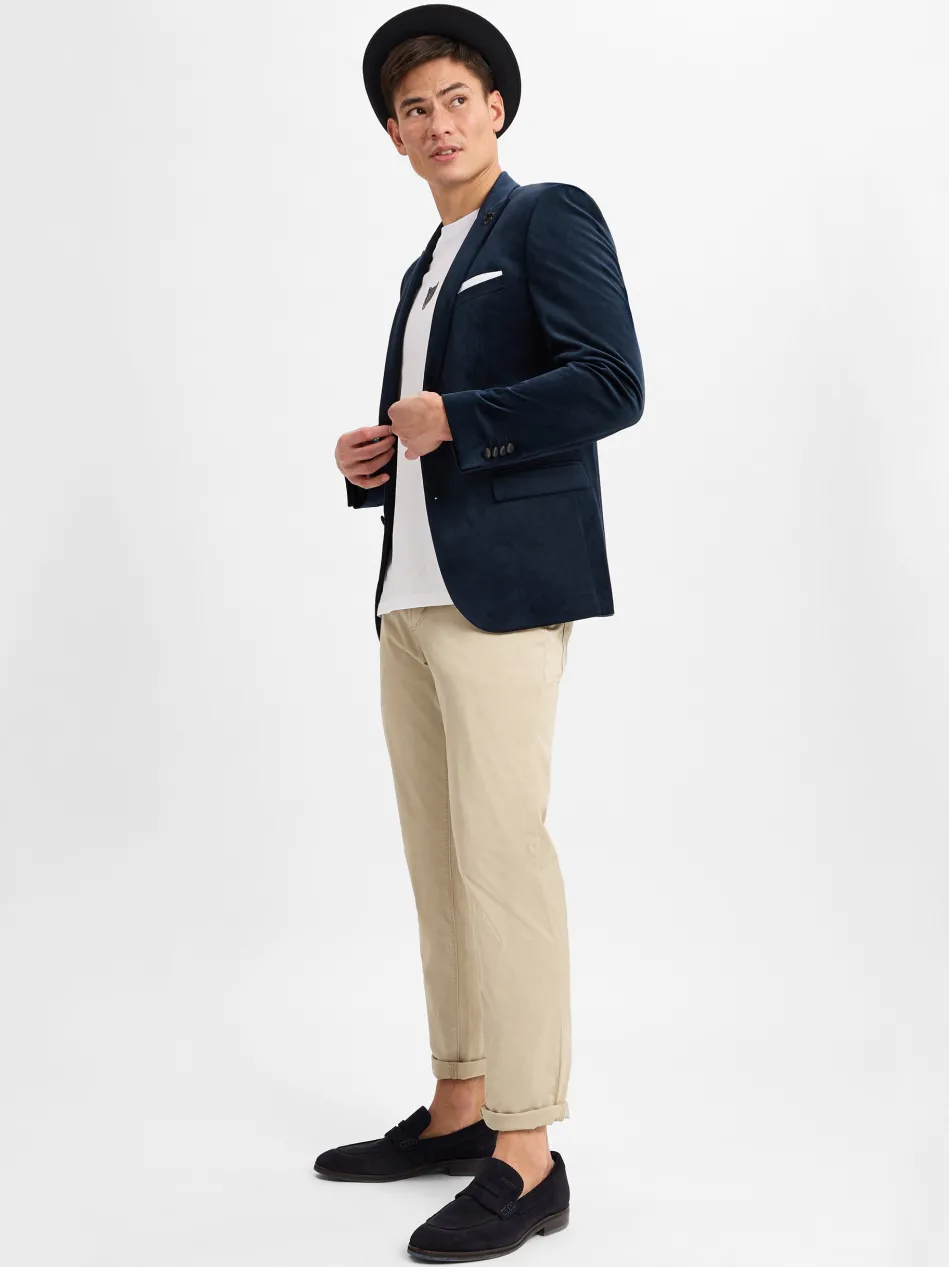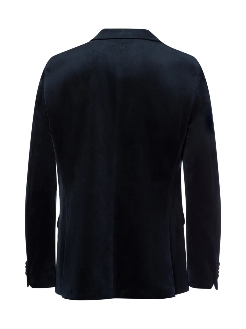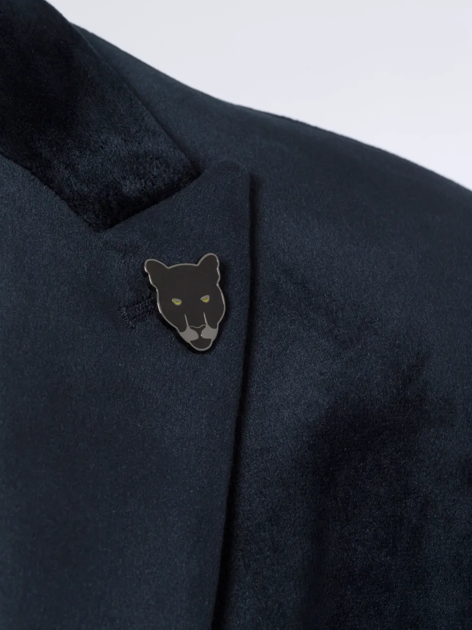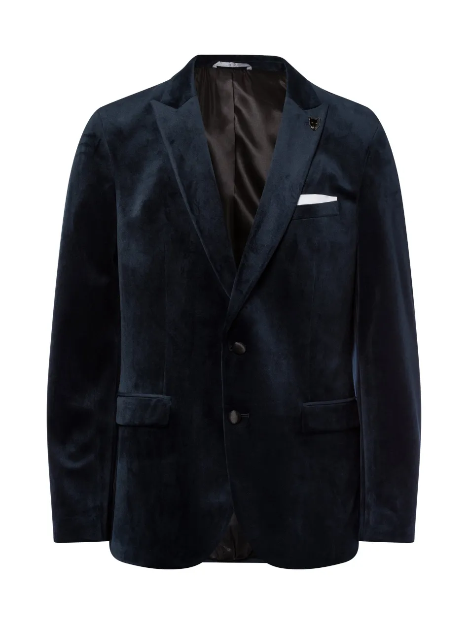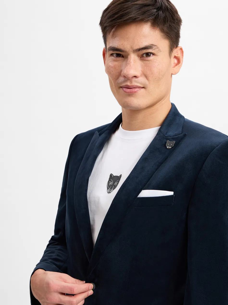 Schimmernder Samt, glänzende Satinknöpfe und ein Revers-Pin mit facettierten Schmucksteinen als krönender Abschluss: Das Sakko von Finshley & Harding London ist ein Highlight.
