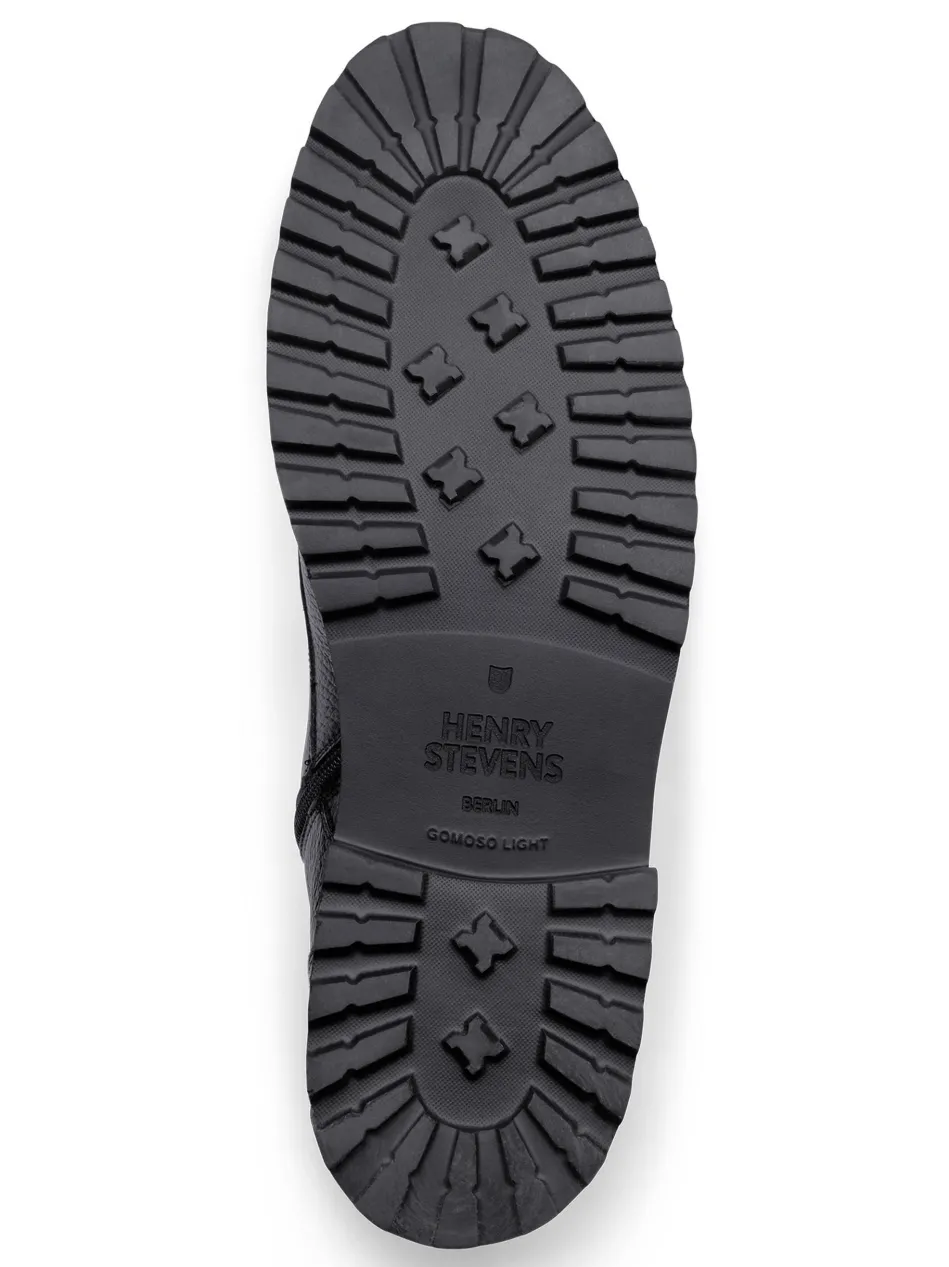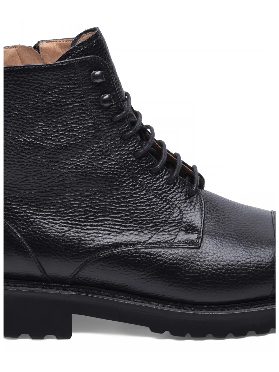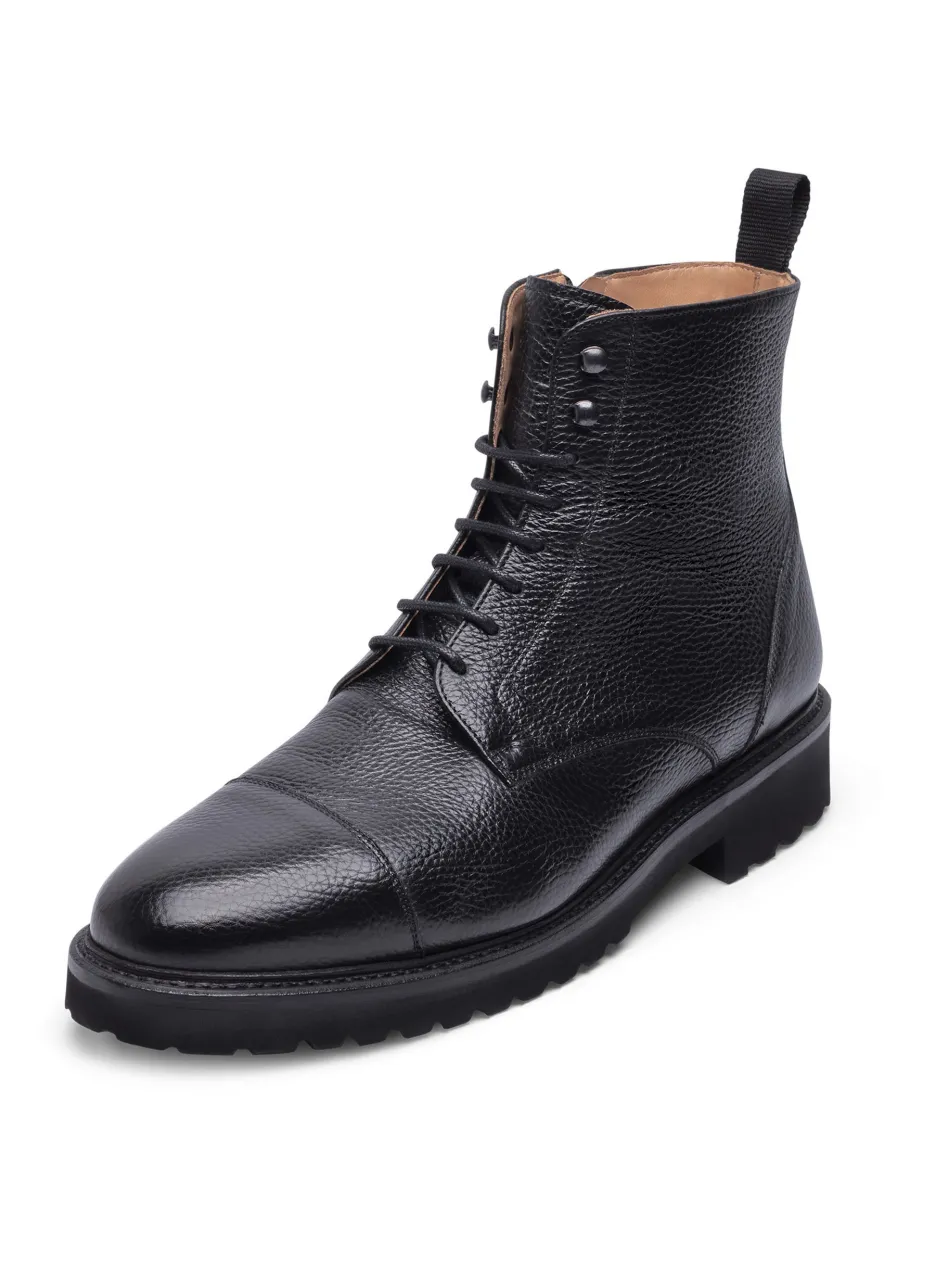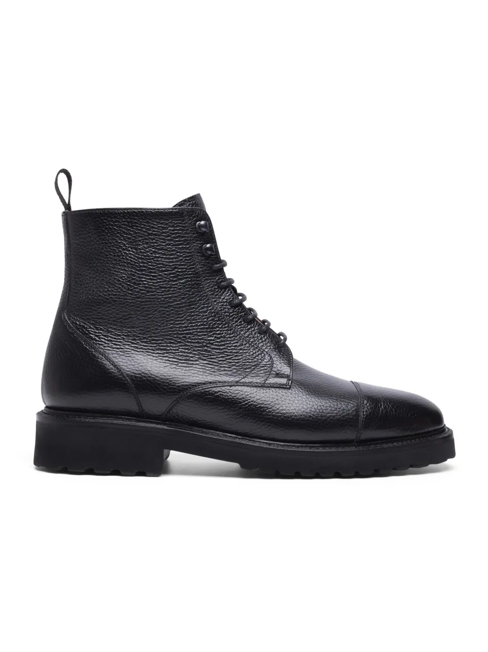 Der handgemachte Winston Captoe Derby Boot in Schwarz ist aus geprägtem Kalbsleder und einem Innenmaterial aus vegetabil gegerbtem Leder gefertigt. Durch seine rahmengenähte Machart und die ultraleichte Gummisohle bietet er höchsten Komfort. Hergestellt in Spanien.