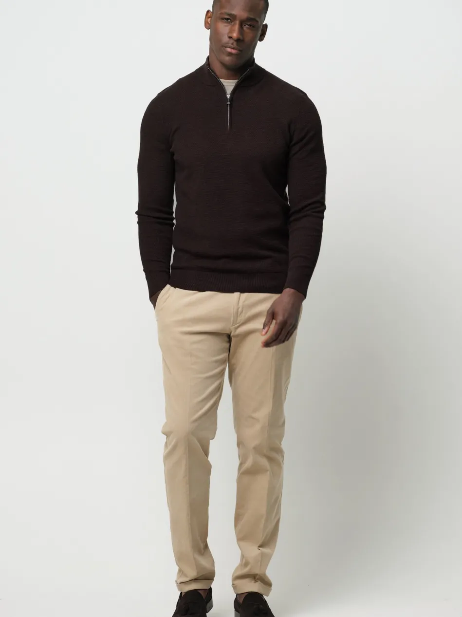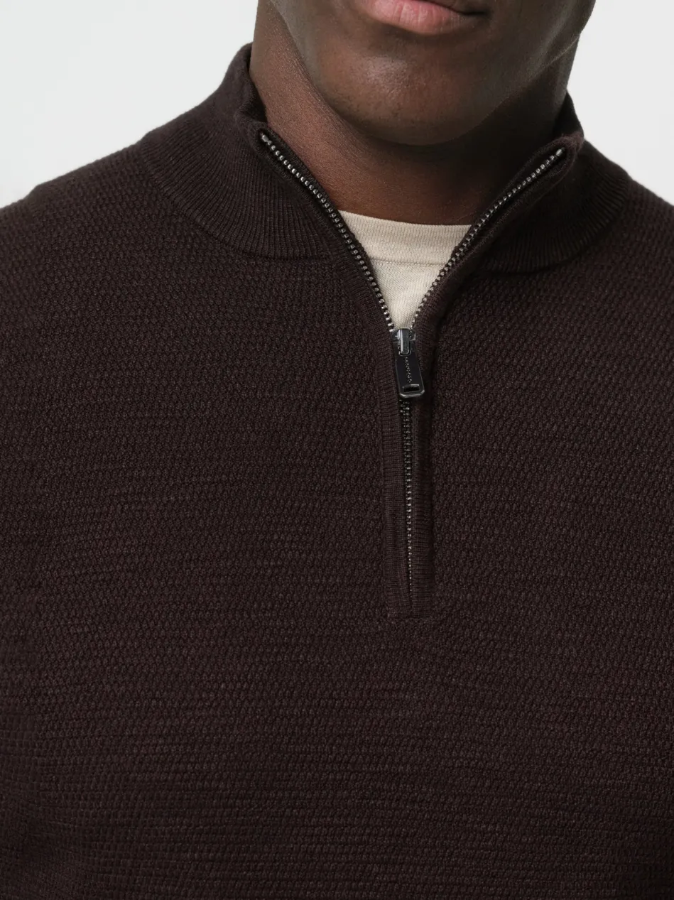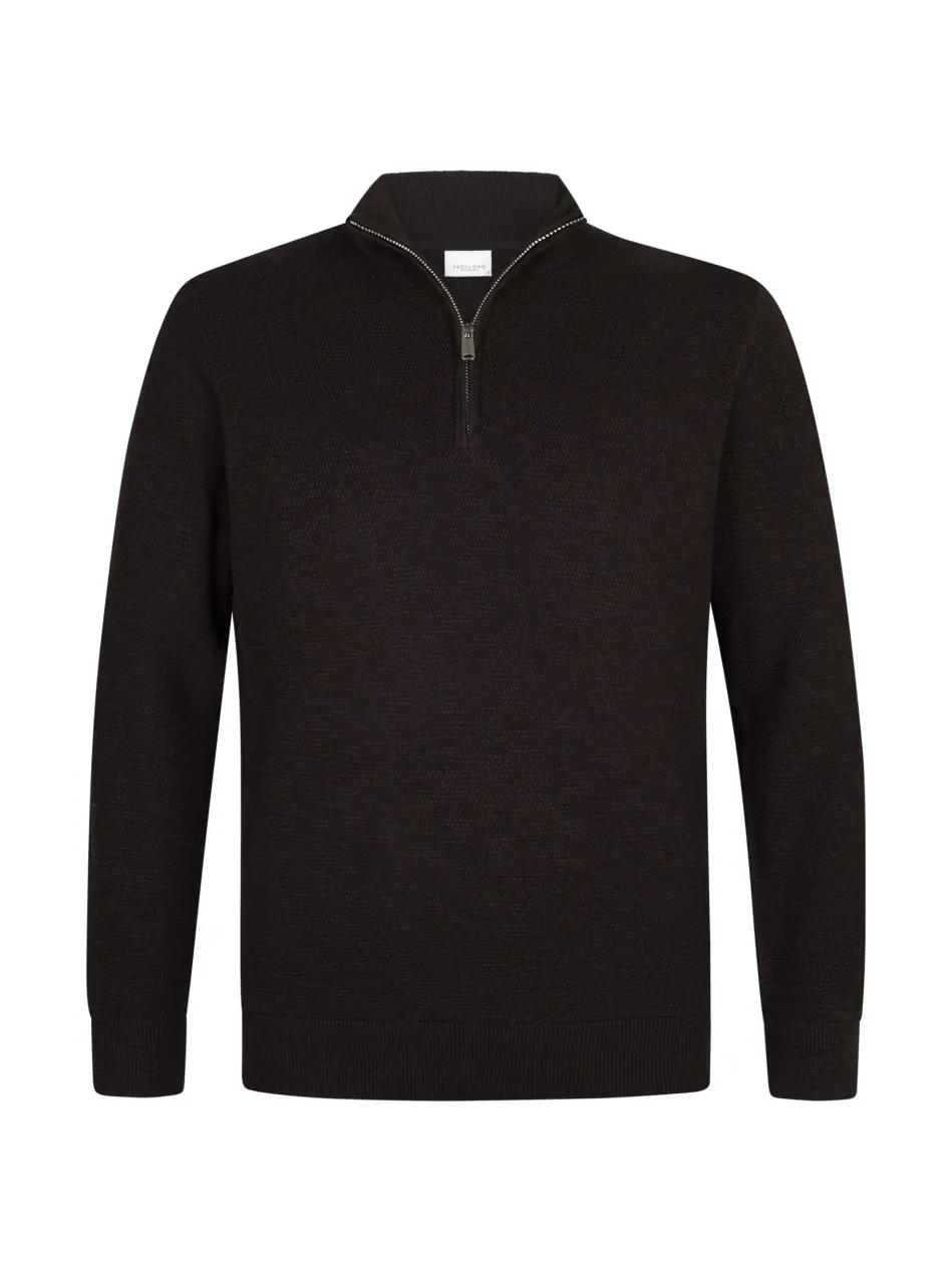 Ein schönes Basic. Dieser Pullover mit halbem Reißverschluss hat eine schöne Struktur und einen Melange-Effekt.