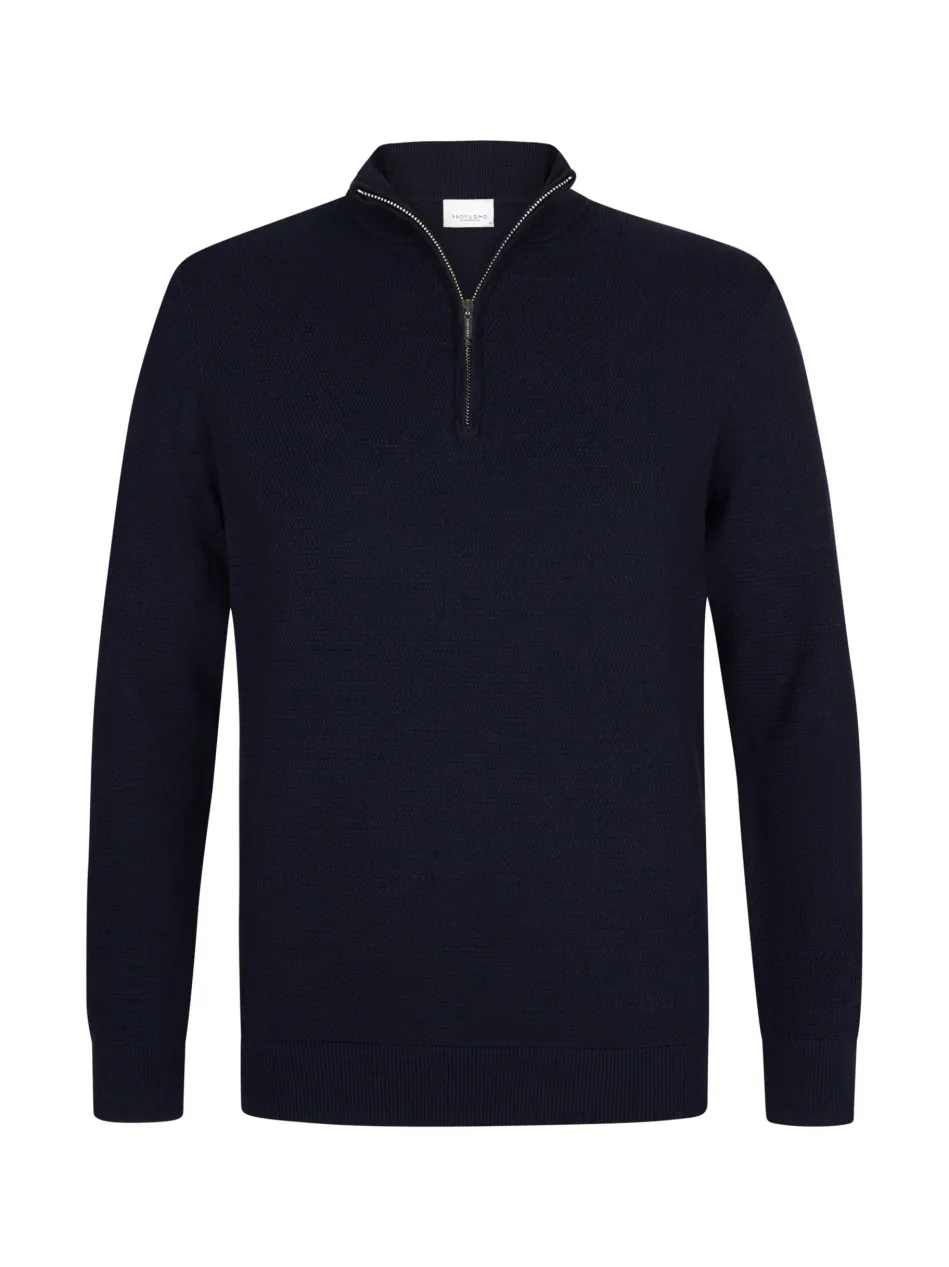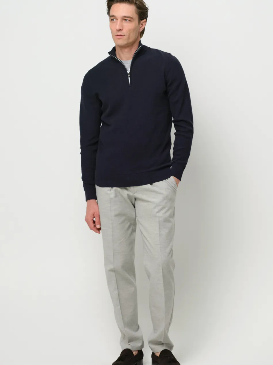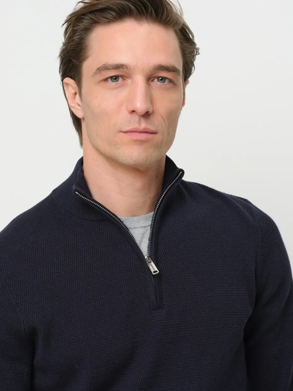 Ein schönes Basic. Dieser Pullover mit halbem Reißverschluss hat eine schöne Struktur und einen Melange-Effekt.