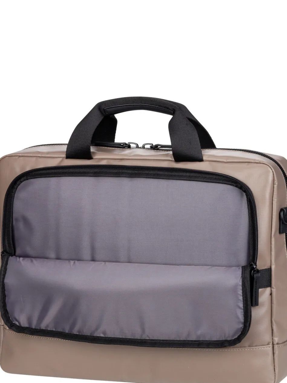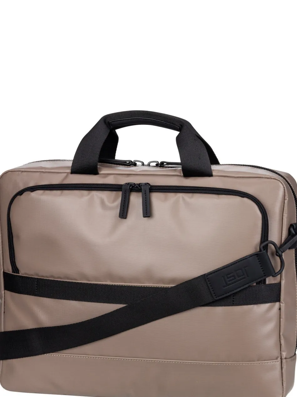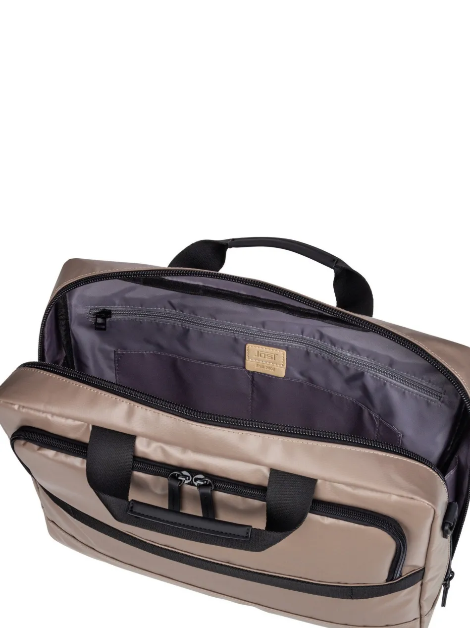 Diese futuristische Aktentasche von Jost, aus wasserabweisendem PU Tarpolin, kombiniert hohe Funktionalität mit cleaner Optik.