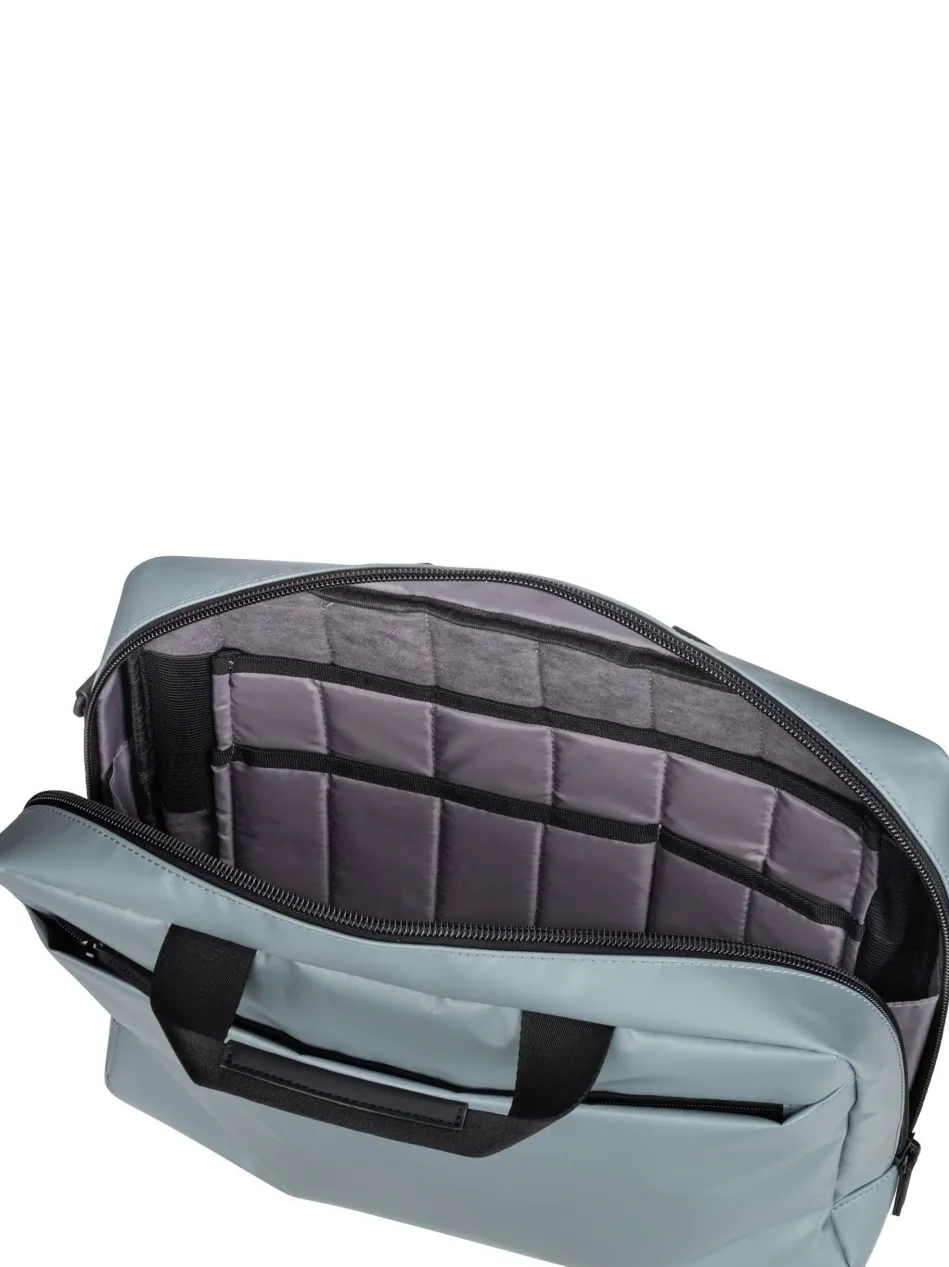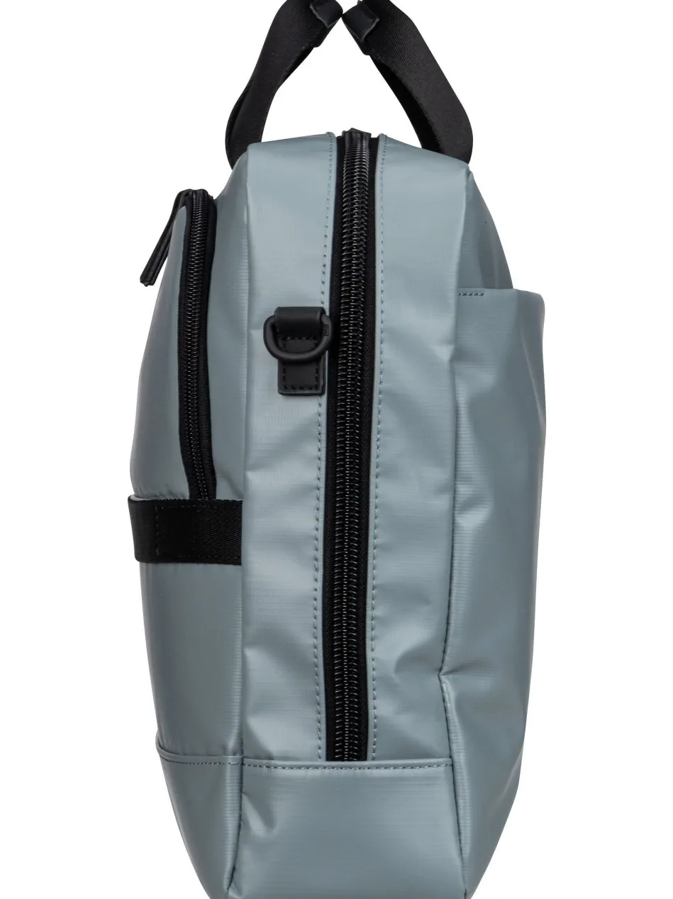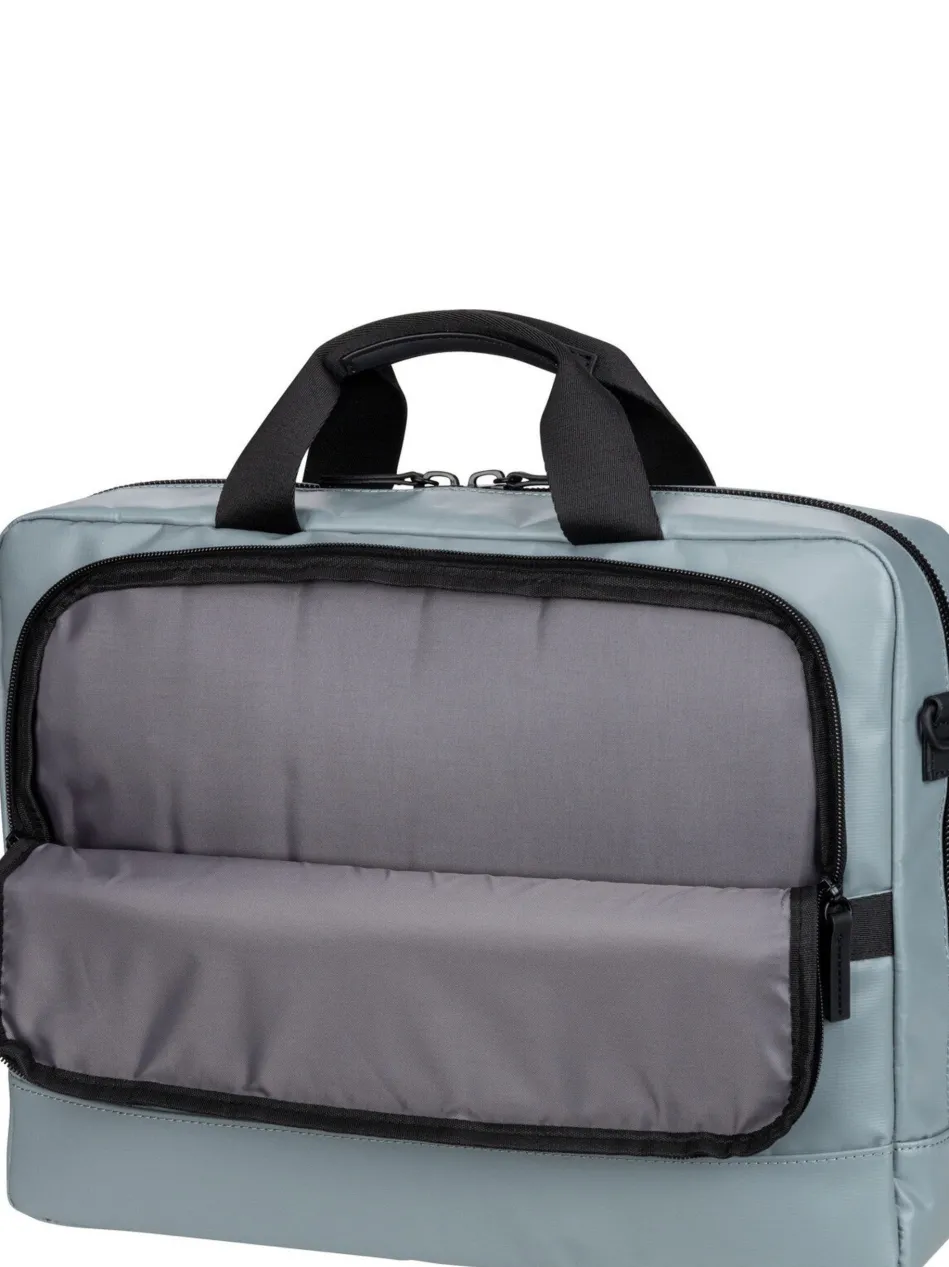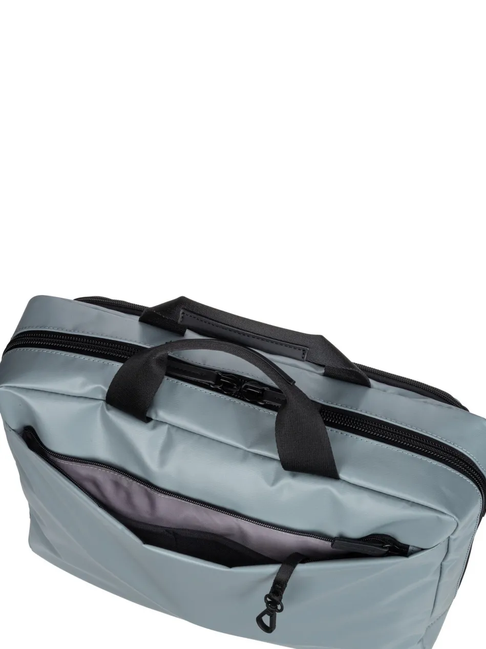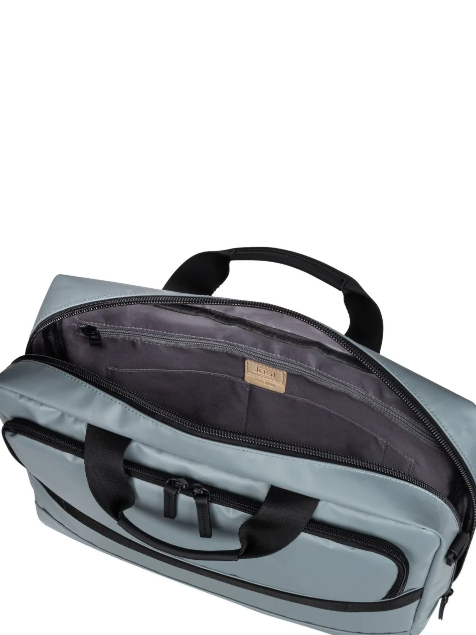 Diese futuristische Aktentasche von Jost, aus wasserabweisendem PU Tarpolin, kombiniert hohe Funktionalität mit cleaner Optik.