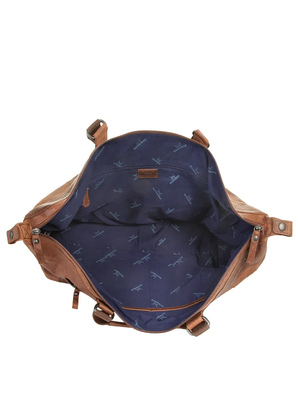 Kernige Leder Reisetasche von Sansibar. Unterwegs muss auf individuellen Stil nicht verzichtet werden! Das offenporige Leder gibt der Reisetasche ihren authentischen und markanten Look. Das großzügige Hauptfach ist ideal für einen Wochenend- oder Städtetrip. Sollten Sie mit einem Koffer reisen, können Sie die Reisetasche ganz entspannt dank Trolleyhalterung auf seinen Teleskopgriff stecken. Die Reisetasche kann in der Hand oder lässig auf der Schulter getragen werden.